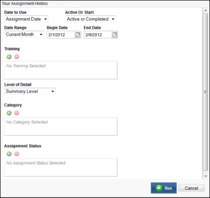 The Assignment History Report displays assignment information such as training title, start date, end date, and time spent.